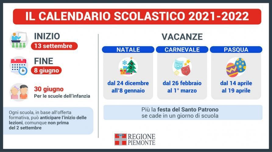 Si informa che l'a.s. 2021/22 avrà inizio lunedì 13 settembre 2021 e terminerà mercoledì 8 giugno 2022 (giovedì 30 giugno 2022 per le scuole dell'infanzia).