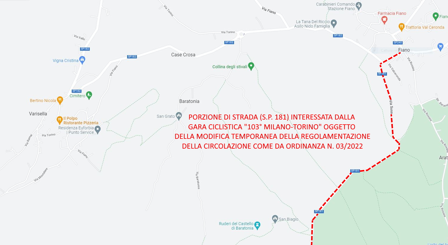 Si comunica che in data odierna il Comune di Varisella sarà interessato dal passaggio della 103° gara ciclistica internazionale Milano-Torino e, per tale ragione, è stata disposta la chiusura totale al traffico veicolare e pedonale, in entrambi i sensi di marcia, della SP 181 indicativamente dalle ore 14.50 fino a fine gara (ore 16 circa).