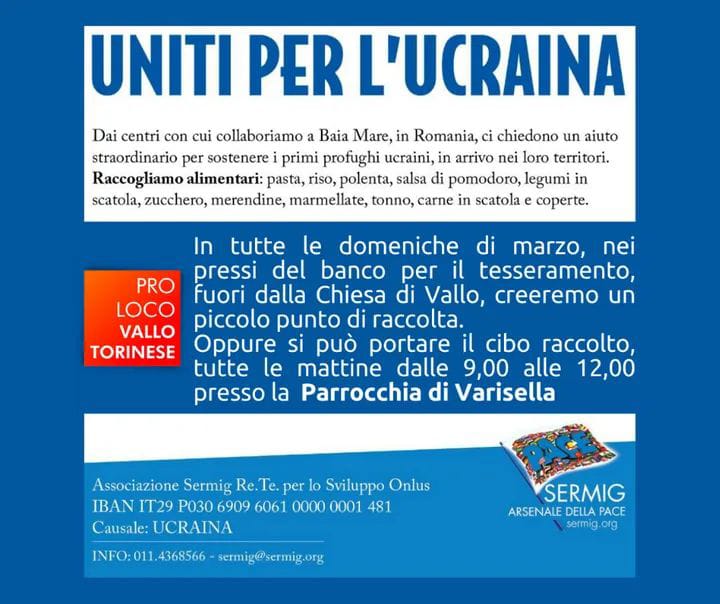 LA PARROCCHIA DI SAN NICOLA VESCOVO DI VARISELLA E LA PRO LOCO DI VALLO TORINESE SUPPORTANO IL PROGETTO UMANITARIO DEL SERMIG RACCOGLIENDO CIBO A LUNGA CONSERVAZIONE.