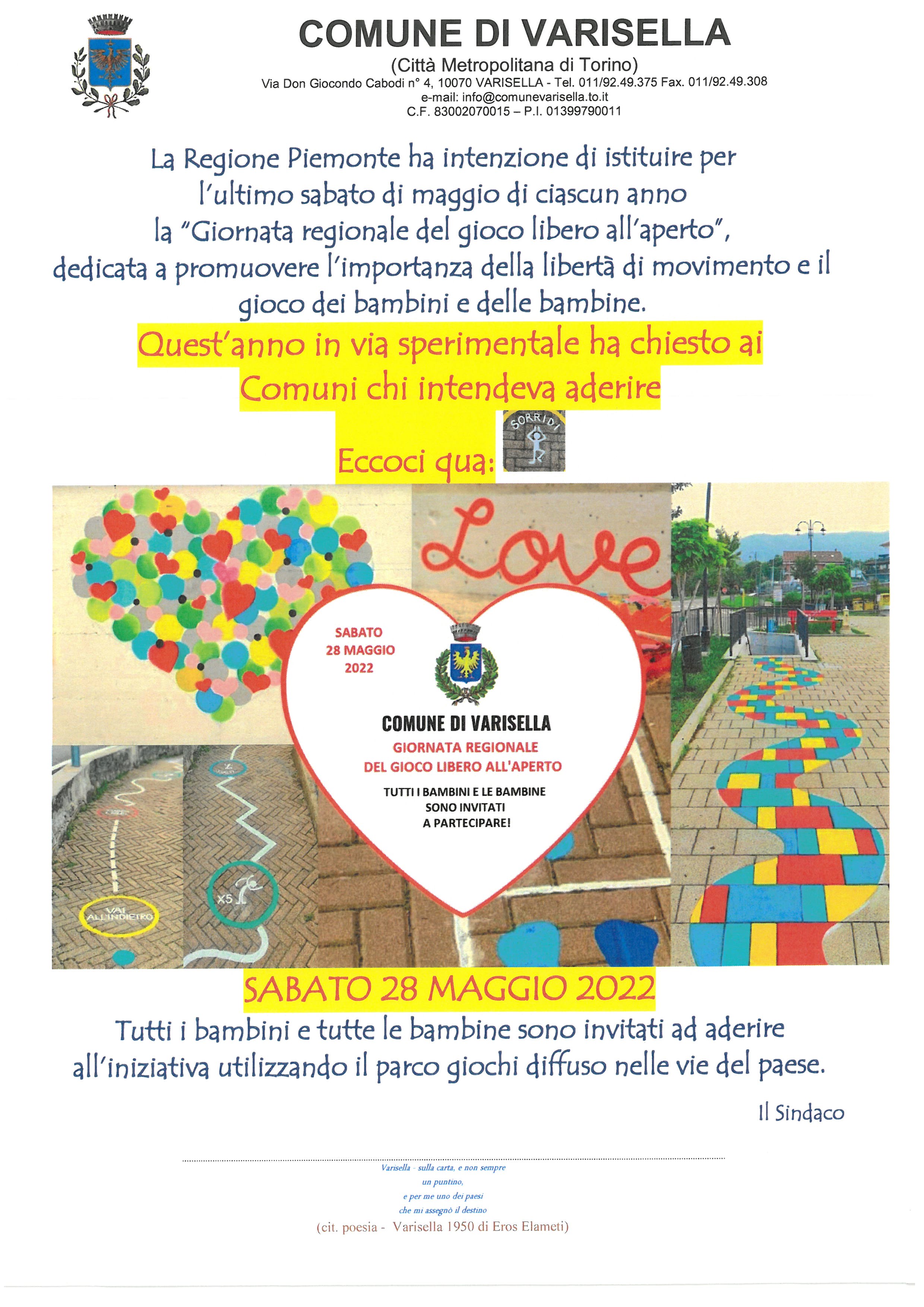 Il Comune di Varisella ha scelto di aderire all'iniziativa invitando tutti i bambini e le bambine ad utilizzare il parco giochi diffuso per le vie del paese.