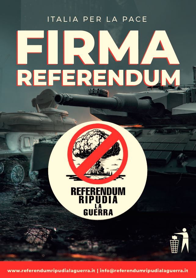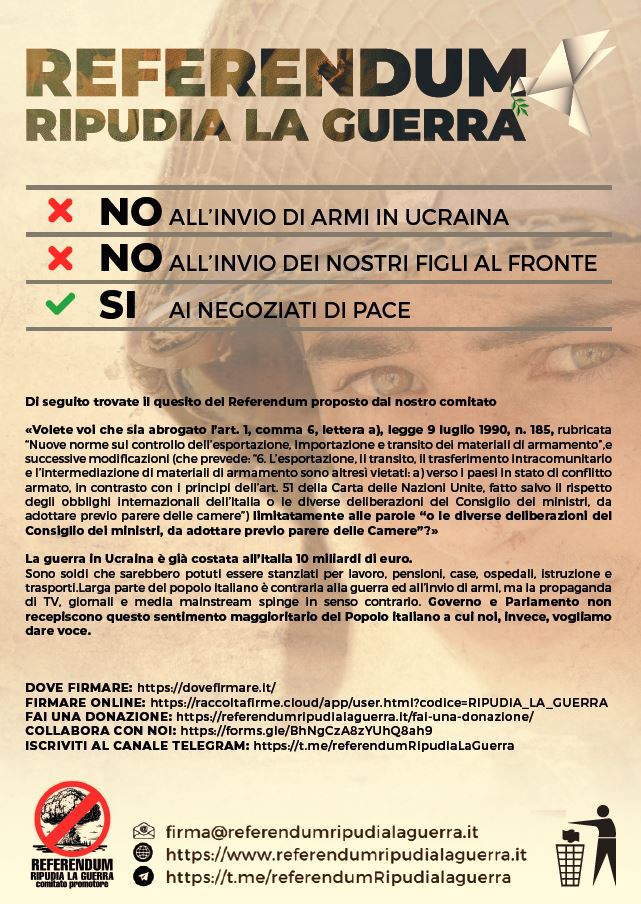 Si avvisa la popolazione che, presso la sede municipale, negli orari di apertura al pubblico, a partire da martedì 23/05/23, è possibile aderire alla raccolta firme per la proposta di legge di iniziativa popolare trasmessa dal Comitato "RIPUDIA LA GUERRA" dal titolo "Abrogazione parziale dell'art. 1, comma 6, lett. a), legge 9 luglio 1990, n. 185 (Nuove norme sul controllo dell'esportazione, importazione e transito dei materiali di armamento e succ. modif.)", pubblicato in Gazzetta Ufficiale Serie Generale nr. 64 del 16.03.2023.
