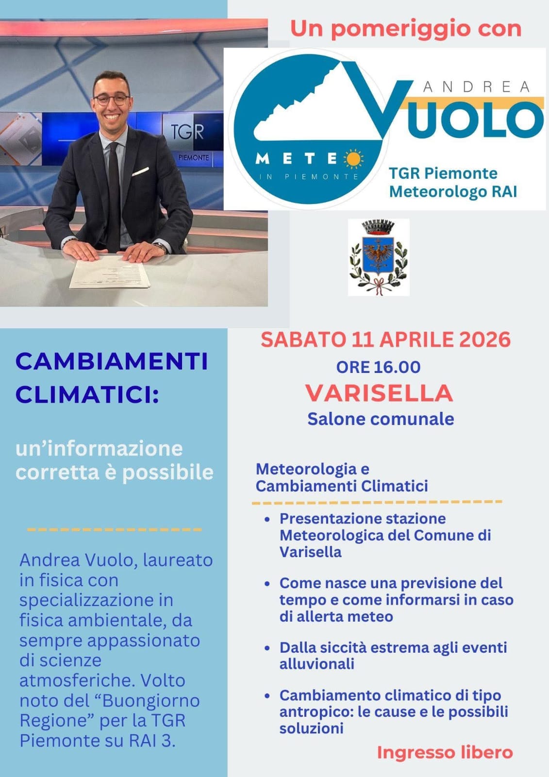 Sabato 11 Aprile alle ore 16 presso il Salone Comunale ci sarà un incontro con Andrea Vuolo - Meteorologo Rai.