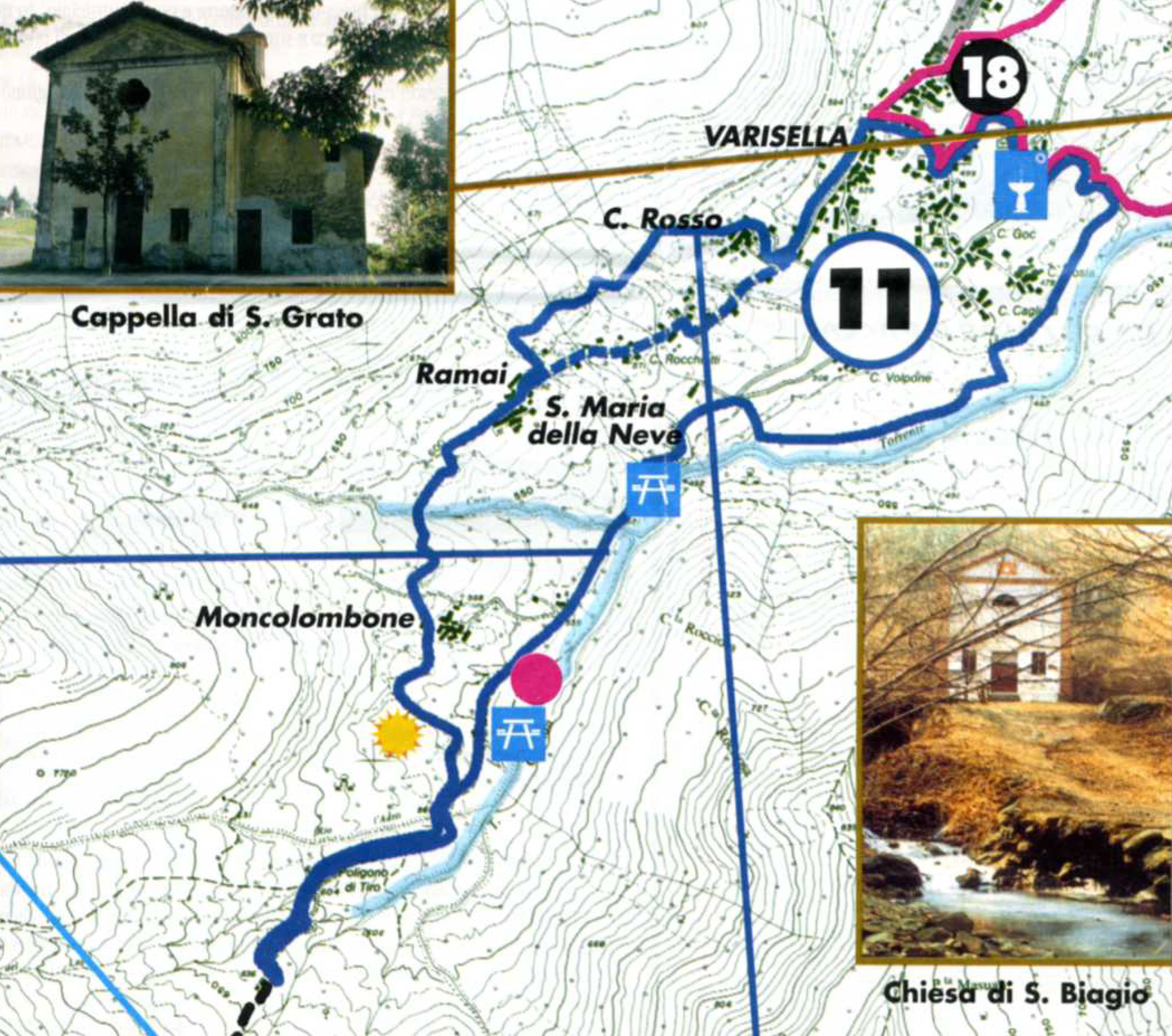 Dal Municipio di Varisella ci si dirige in discesa verso Borgata Costa da dove, sempre in discesa ma su strada sterrata, raggiungiamo il torrente Ceronda. Fiancheggiando la sponda sinistra del torrente, si imbocca una leggera salita che si immerge in una zona boscosa suggestiva. L’itinerario prosegue su un sentiero chiuso da antichi muretti in pietra che ci guidano, nell'ultimo tratto in ripida salita, alla strada asfaltata che conduce alla Chiesa della Madonna della Neve, posta in località panoramica a strapiombo sul torrente Ceronda. Si prosegue sempre in salita, su strada prima asfaltata poi sterrata, sino ad un alpeggio (630 m). Al ritorno, giunti sull'ampio piazzale adiacente al ponte sul Ceronda, imbocchiamo sulla sinistra, tra betulle ed eriche, un sentiero sterrato che porta all'antica Borgata Moncolombone. Qui inizia un tracciato molto suggestivo con attraversamento dal Rio Creus ( su un ponticello in legno) fino alla Borgata Ramai. All'uscita della borgata ha inizio, a sinistra, una lunga rampa in salita che arriva, in uno dei tratti più tecnici del percorso e che, attraverso la Borgata Rosso, conduce alla piazza di Varisella. Esiste la possibilità, usciti dalla Borgata Ramai, di proseguire diritto su strafa asfaltata, verso la Borgata Rosso. Questo percorso è indicato a coloro che hanno ottime capacità fisiche e tecniche, visti i tratti impegnativi che costeggiano il torrente Ceronda e il tratto compreso tra la Borgata Ramai e la Borgata Rosso.