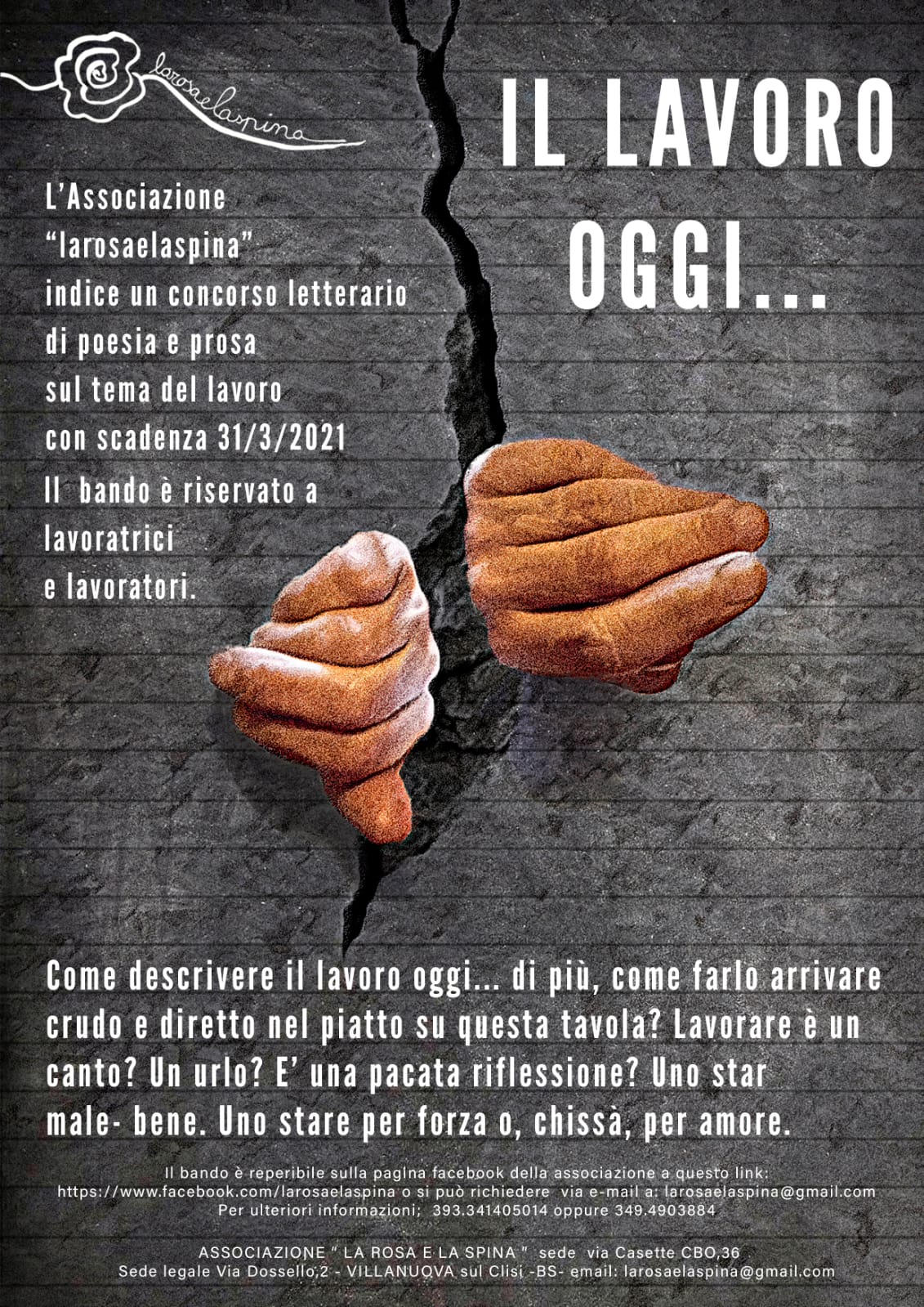 A nome e per conto dell'Associazione culturale "La rosa e la spina " di Villanuova sul Clisi (BS), realtà presente sul territorio da oltre dieci anni, si comunica l'indizione di un concorso letterario sul tema del lavoro come da locandina e bando qui allegati.