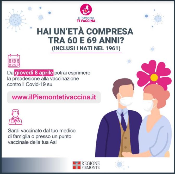 Hai un'età compresa tra i 60 e i 69 anni (inclusi nati nel 1961)? Da giovedì 8 aprile potrai esprimere la preadesione alla vaccinazione contro il Covid-19 su www.ilPiemontetivaccina.it.
