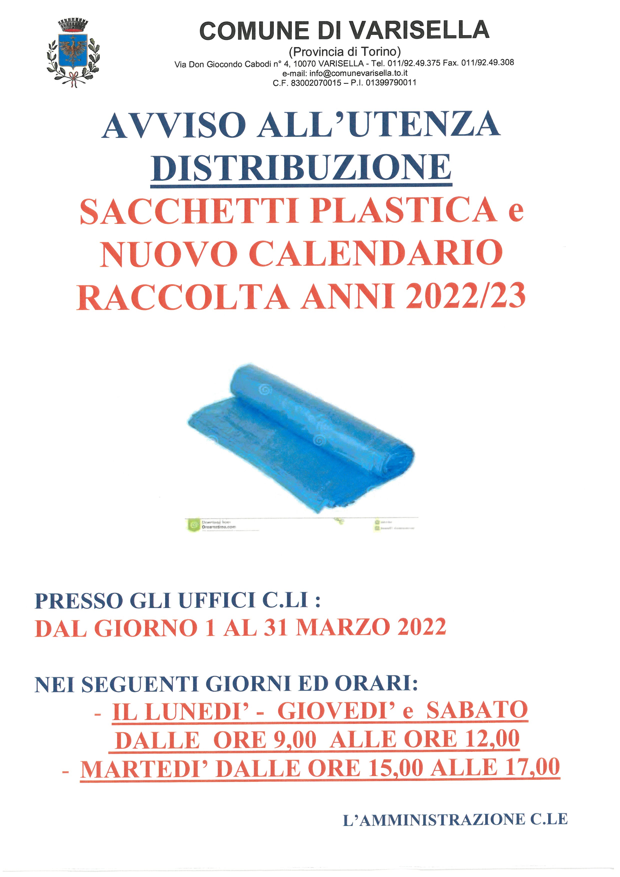 Si avvisa che a partire da martedì 1 marzo 2022 avrà inizio la distribuzione dei sacchi per la raccolta della plastica e dei nuovi calendari forniti dal Consorzio C.I.S.A. di Ciriè per la raccolta differenziata per gli anni 2022 e 2023.