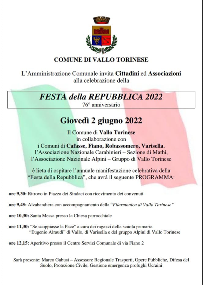 Quest'anno le celebrazioni per la Festa della Repubblica del 2 giugno 2022 si sono tenute presso il Comune di Vallo Torinese, in collaborazione anche con i Comuni di Cafasse, Fiano e Robassomero.