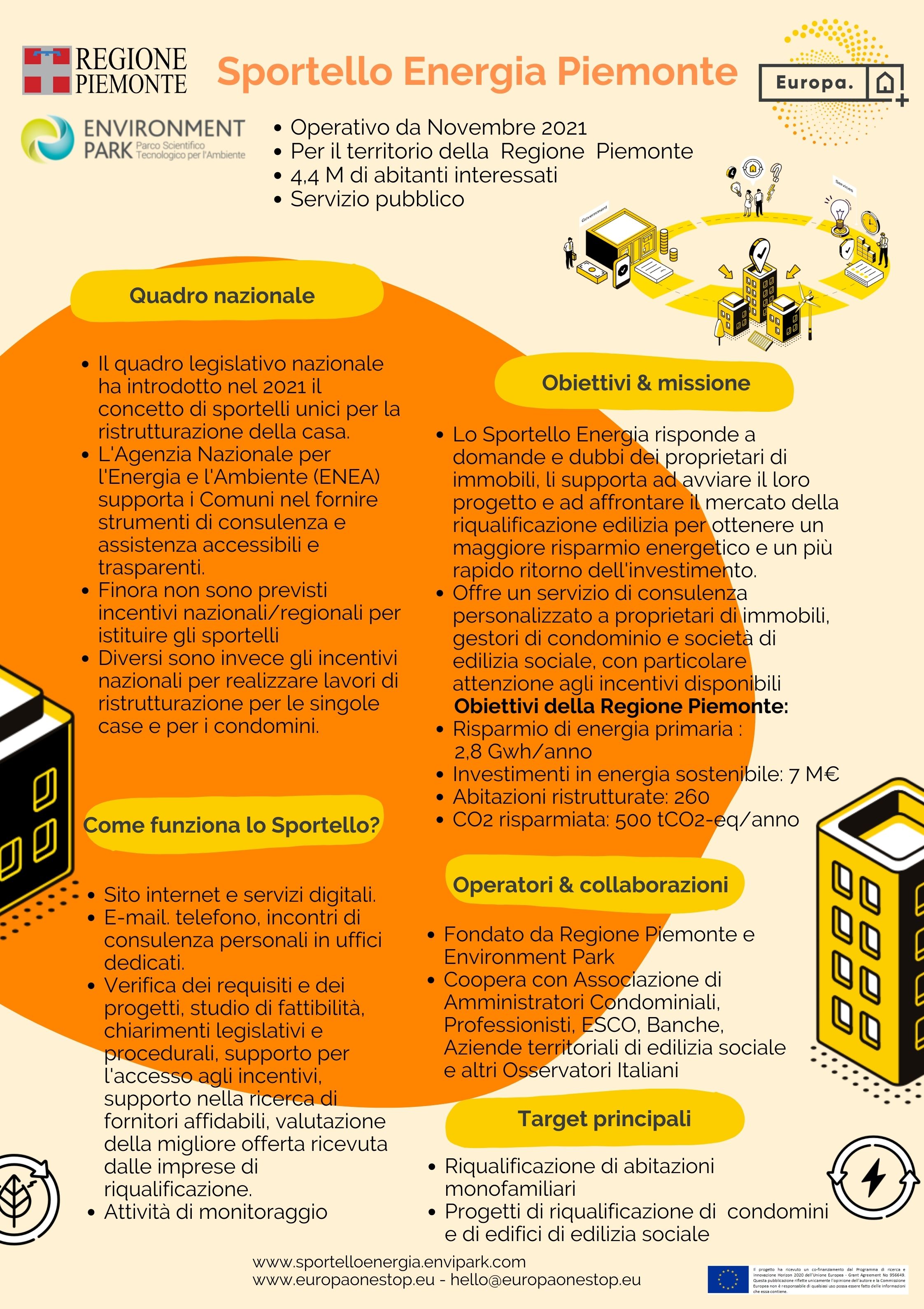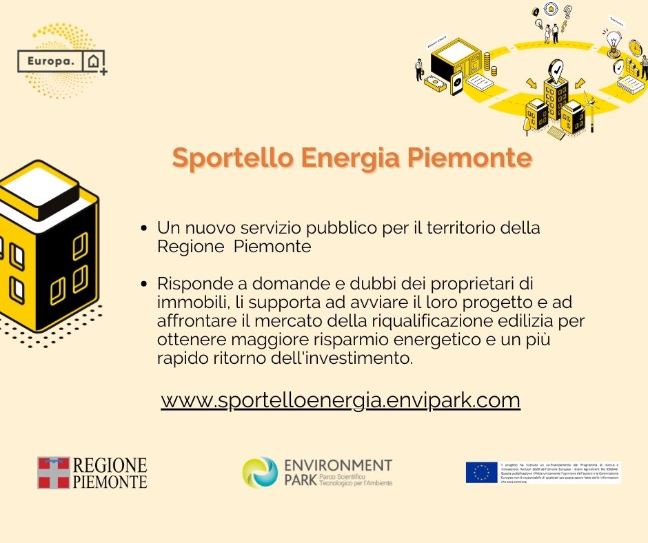 Si riportano in allegato le locandine informative relative allo Sportello Energia Piemonte, che si propone come un nuovo servizio pubblico dedicato ai cittadini del territorio piemontese. Esso fornisce l’opportunità di usufruire di una consulenza gratuita finalizzata a rispondere a domande e dubbi dei proprietari di immobili che debbano affrontare lavori di riqualificazione energetica della loro casa. Lo Sportello li supporta a chiarire aspetti tecnici e finanziari legati all’attuazione dell’intervento, ad avviare il loro progetto e ad affrontare con i giusti strumenti informativi il mercato della ristrutturazione edilizia per ottenere un maggiore risparmio energetico e un più rapido ritorno del loro investimento.