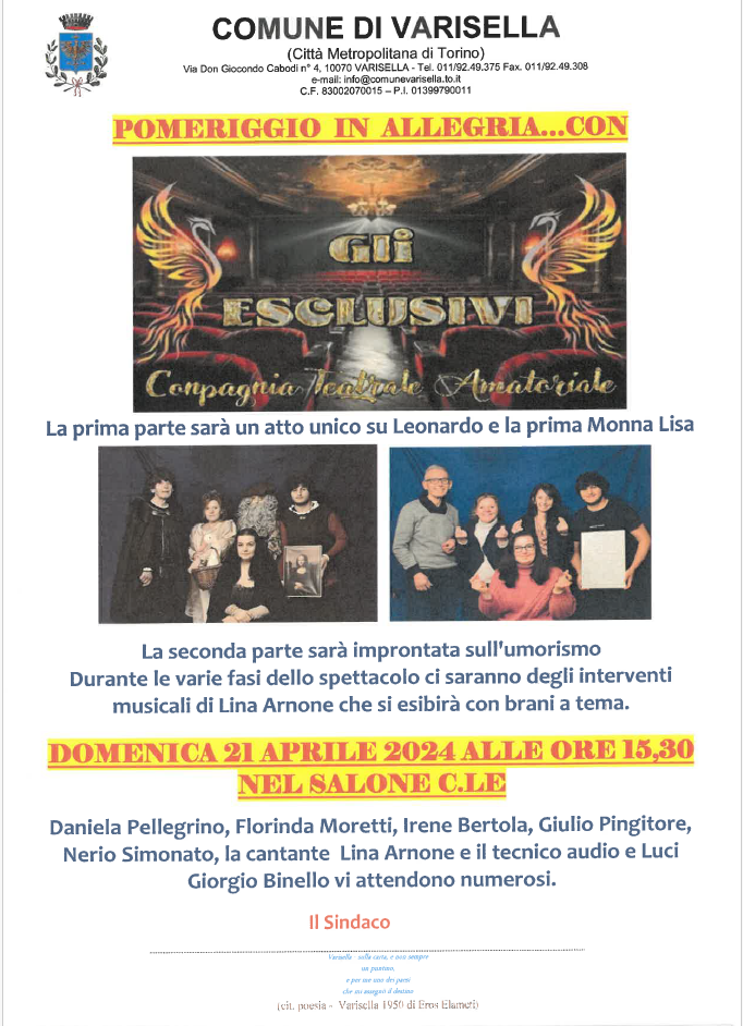 Domenica 21 aprile alle ore 15.30 nel Salone Comunale ci sarà la Compagnia Teatrale con lo spettacolo "Gli Esclusivi".