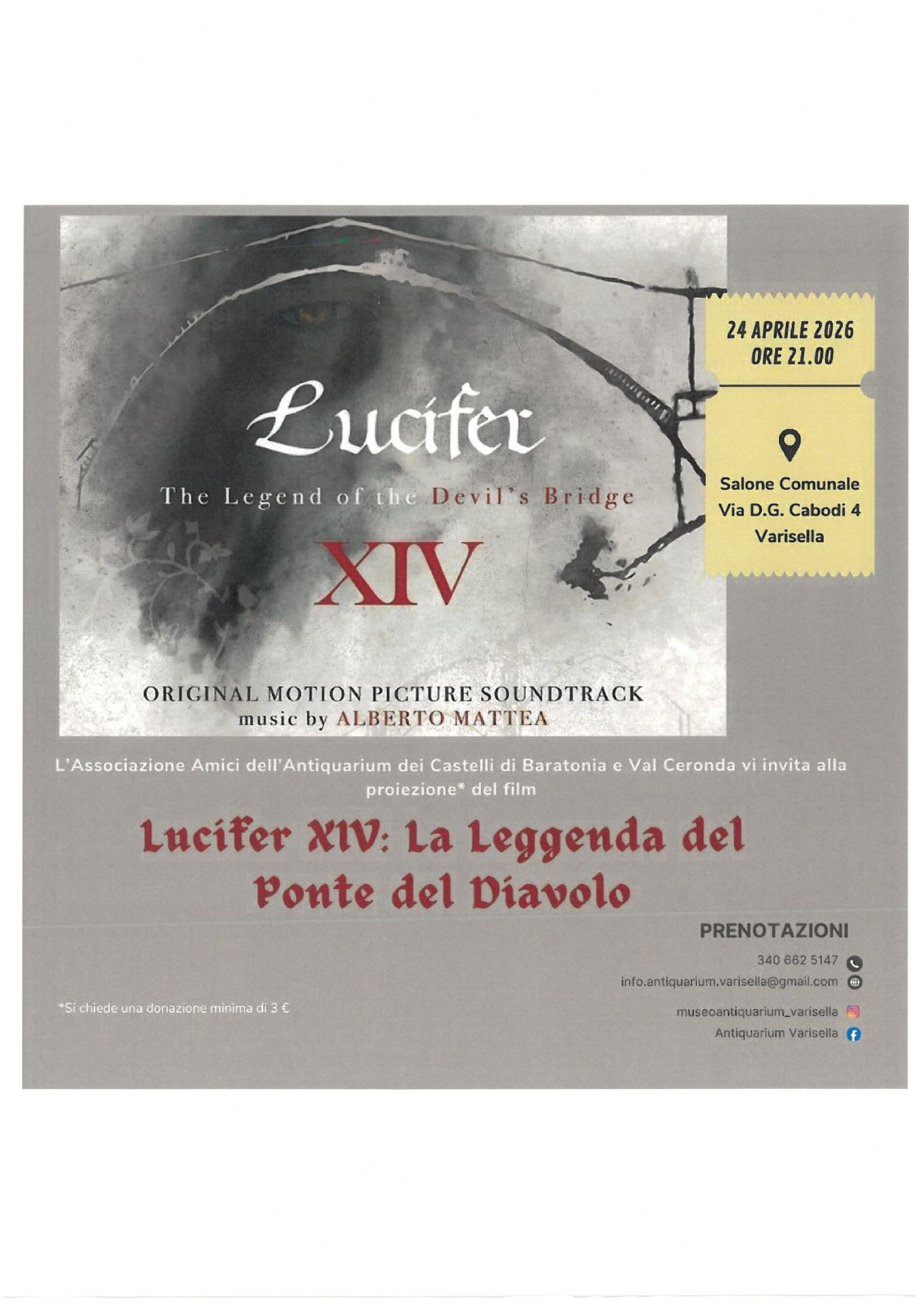 Venerdì 24 Aprile alle ore 21 presso il salone Comunale si terrà la proiezione del film "Lucifer XIV: La Leggenda del Ponte del Diavolo".
