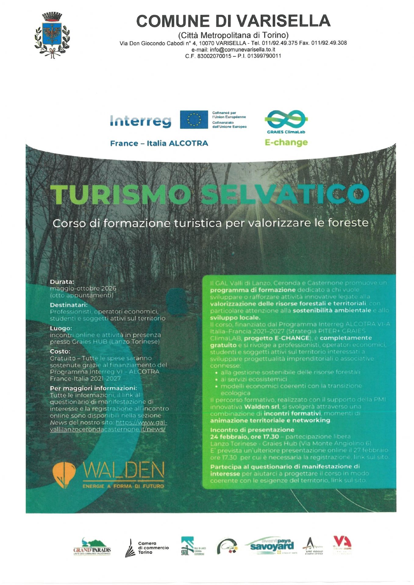 Il corso è completamente gratuito, finanziato dal programma Interreg Alcotra Italia-Francia 2021-2027, ed è rivolto a professionisti, operatori economici, studenti e a tutte le persone attive sul territorio interessate a far crescere progetti imprenditoriali o associativi legati alla gestione sostenibile dei boschi, ai servizi ecosistemici e a modelli economici coerenti con la transizione ecologica.